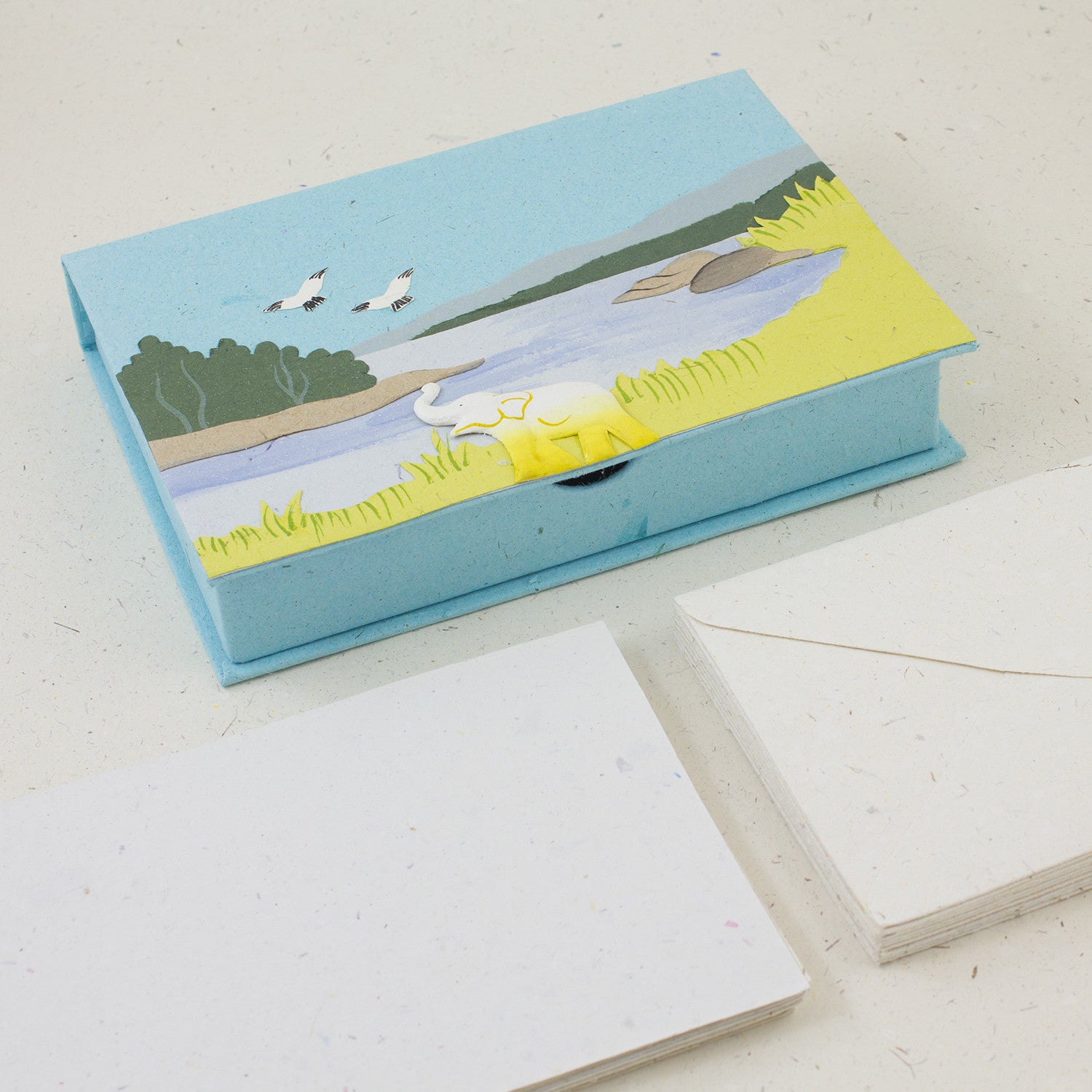 Adorned with a handcrafted elephant motif, each box expresses a celebration of these majestic creatures. Inside, you'll discover 20 sheets of our unique poo paper and 10 matching envelopes, perfect for sending a note that stands out.