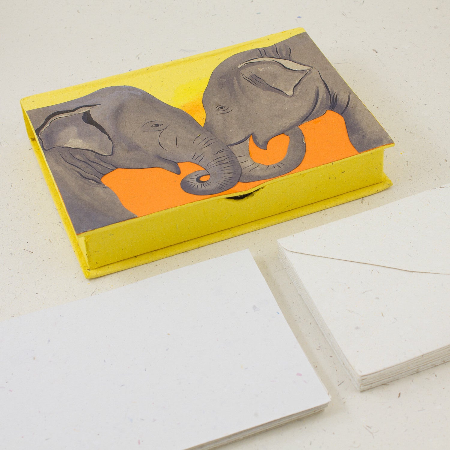 Adorned with a handcrafted elephant motif, each box expresses a celebration of these majestic creatures. Inside, you'll discover 20 sheets of our unique poo paper and 10 matching envelopes, perfect for sending a note that stands out.