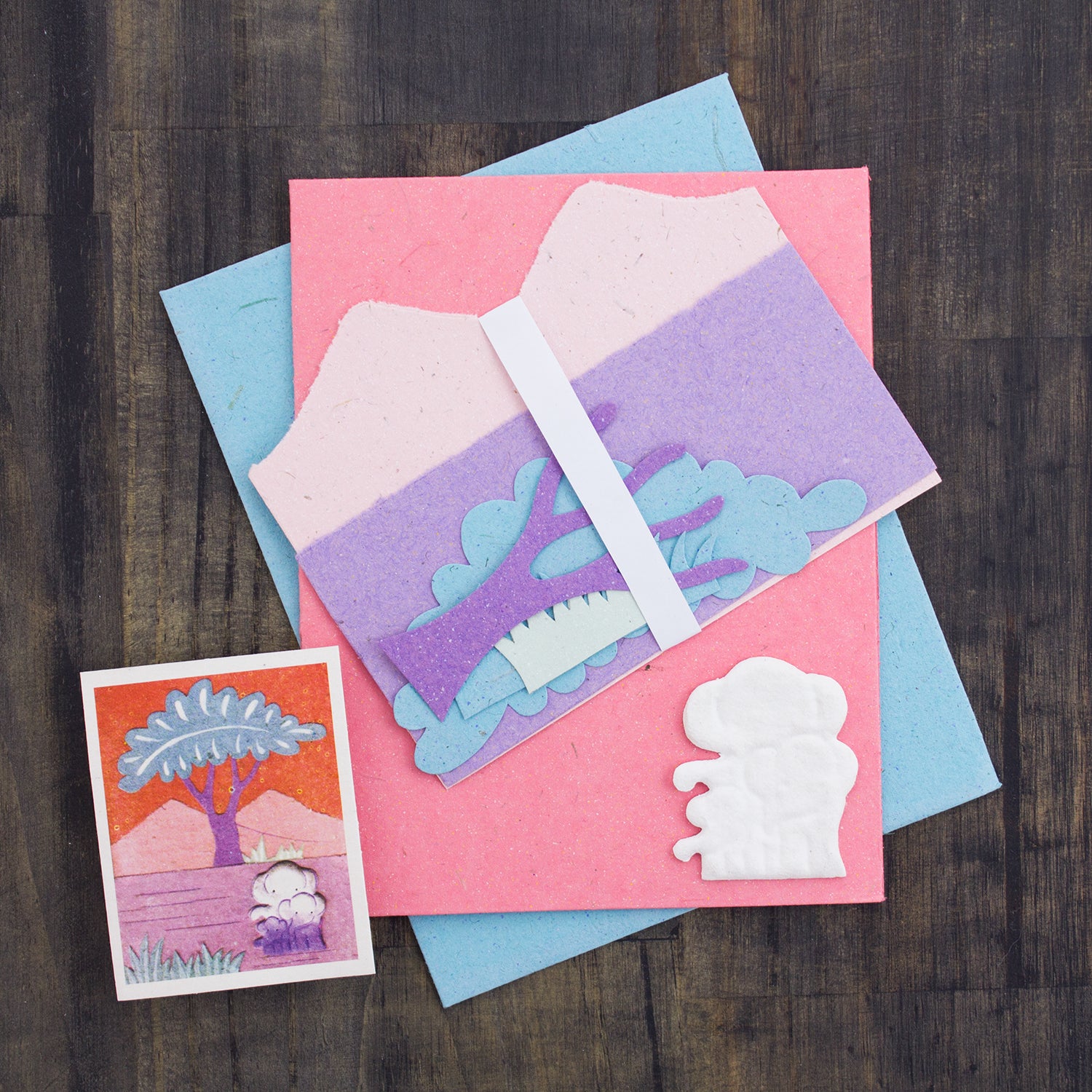 Each blank card comes complete with pre-cut and a torn scenery set that consists of a paper pulp embellishment of an Elephant to hand decorate. A photo reference is also included for those that want to try their hand at recreating what our artisans do!