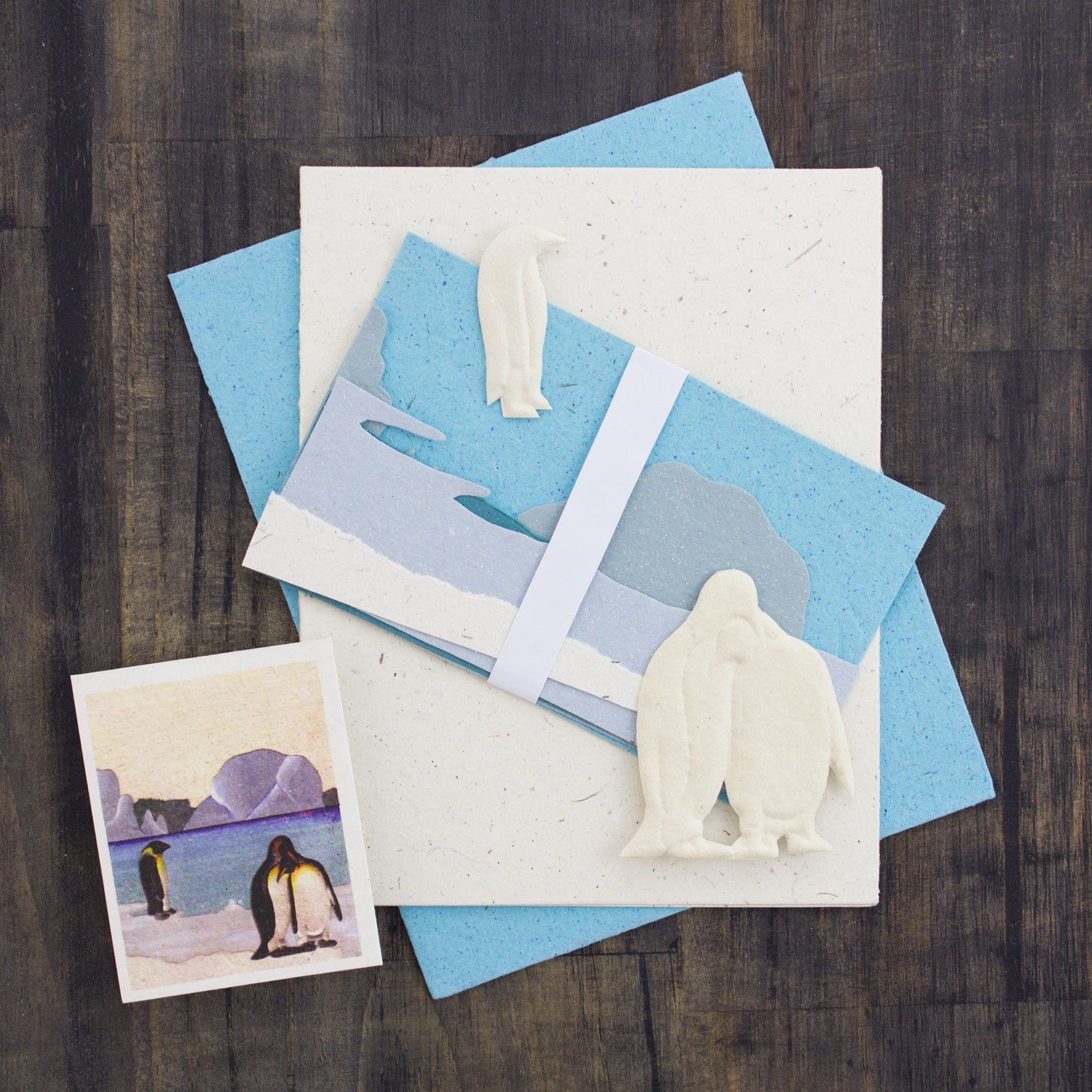 Each blank card comes complete with pre-cut and a torn scenery set that consists of a paper pulp embellishment of a Penguins to hand decorate. A photo reference is also included for those that want to try their hand at recreating what our artisans do!