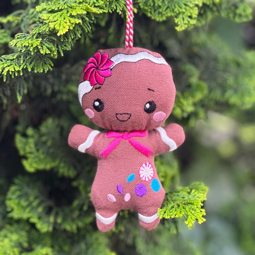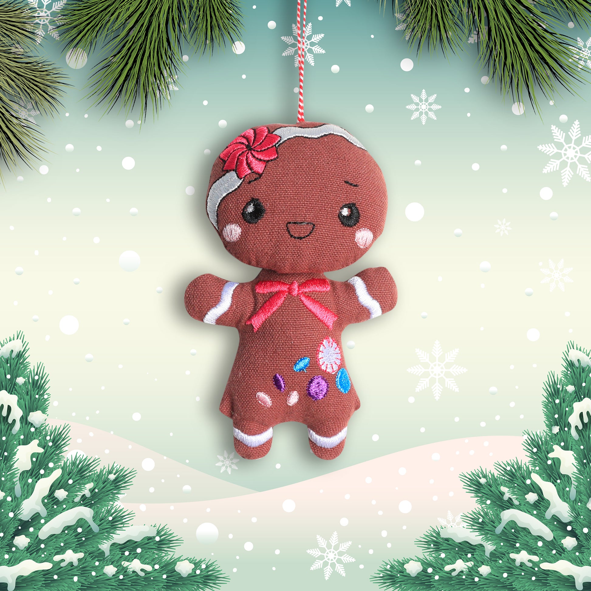 Made from soft, 100% cotton and filled with plush poly-fill, these ornaments offer a delightful texture that's both inviting and durable. The unique design of the gingerbread girl, complete with adorable detailing, brings the classic holiday cookie to life in fabric form, ready to hang on your tree or decorate your space.