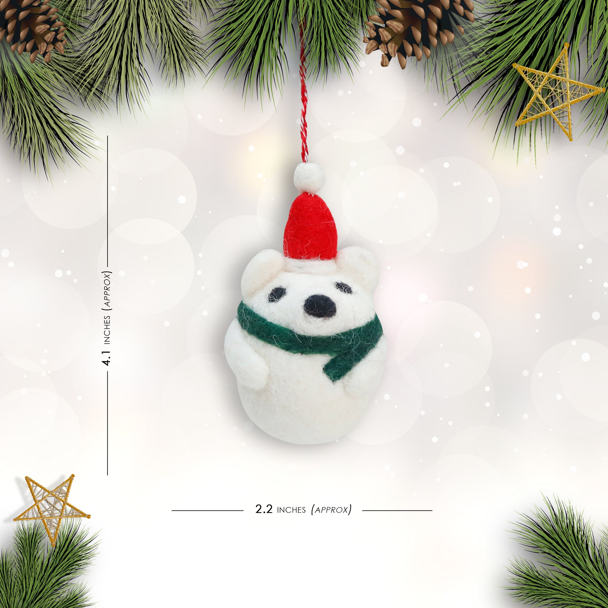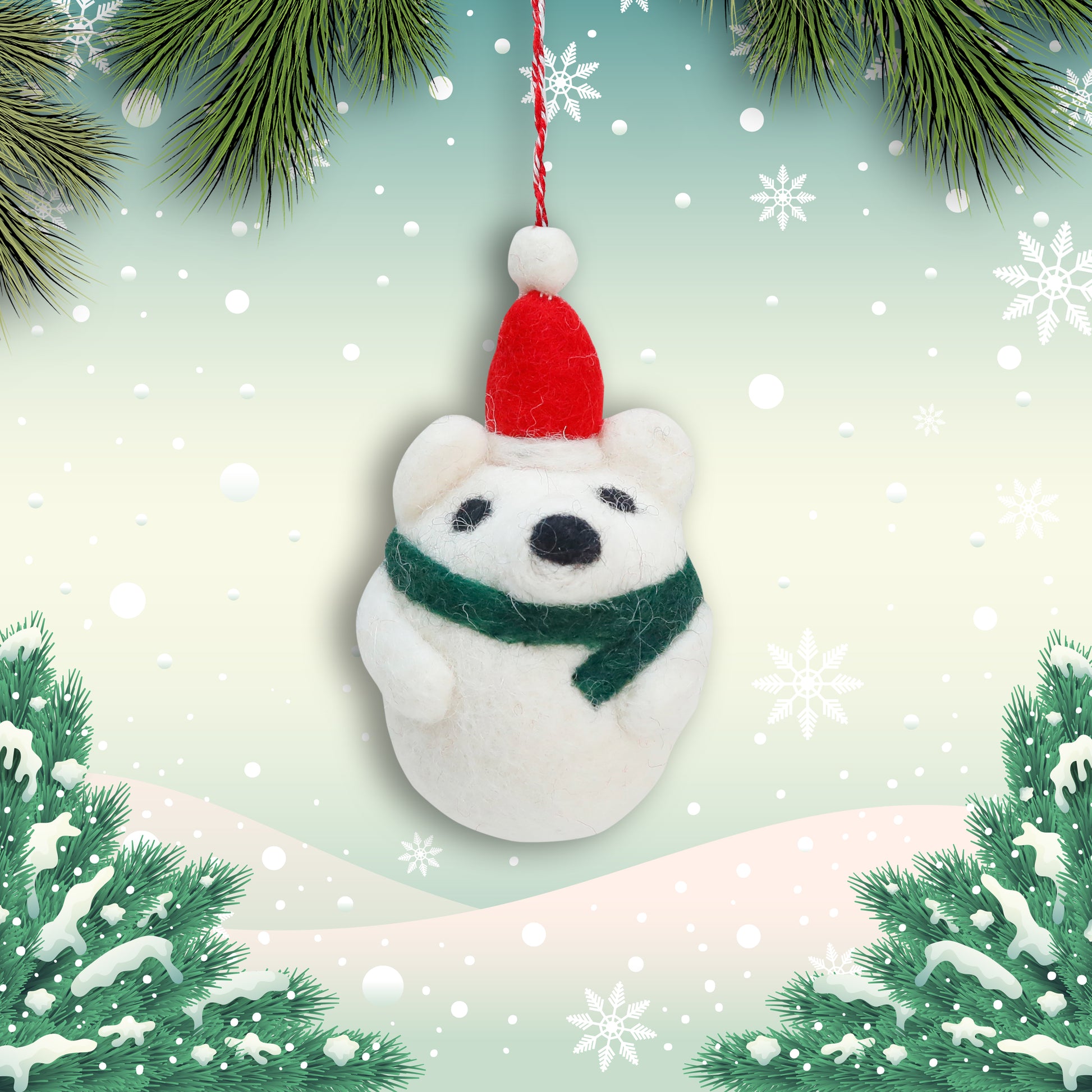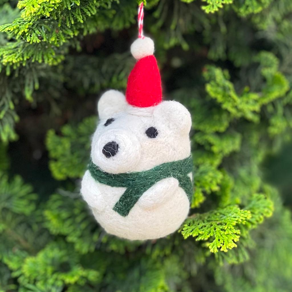 Introducing our adorable Polar Bear felted ornament, meticulously handcrafted by skilled artisans in Nepal! Elevate your holiday decor with this charming creation, designed to add a touch of whimsy and Arctic charm to your Christmas tree. Made with love and attention to detail, each ornament is a unique piece of art that showcases the talent and dedication of our artisans. Bring joy and delight to your festivities with this delightful Polar Bear ornament, guaranteed to spark admiration and wonder. Don't miss out on the opportunity to adorn your tree with the cutest Polar Bear ornament you've ever seen!