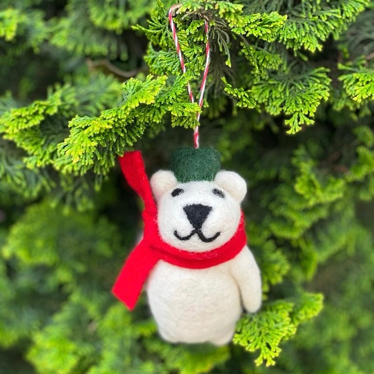 Introducing our adorable Polar Bear felted ornament, meticulously handcrafted by skilled artisans in Nepal! Elevate your holiday decor with this charming creation, designed to add a touch of whimsy and Arctic charm to your Christmas tree. Made with love and attention to detail, each ornament is a unique piece of art that showcases the talent and dedication of our artisans. Bring joy and delight to your festivities with this delightful Polar Bear ornament, guaranteed to spark admiration and wonder. Don't miss out on the opportunity to adorn your tree with the cutest Polar Bear ornament you've ever seen!