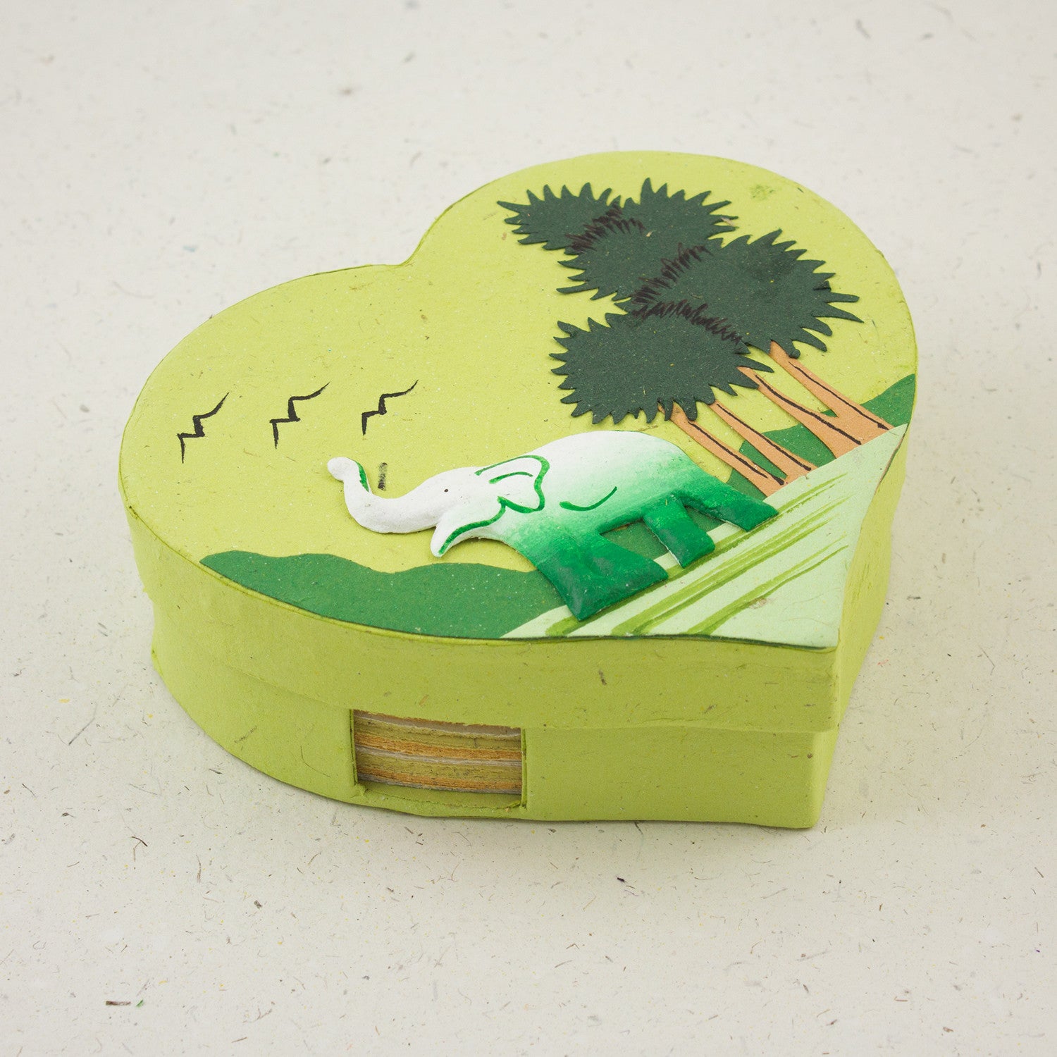 Explore our charming Heart Shaped Note Box Elephant Light Green! Elevate your note-taking experience with our eco-friendly alternative to post-it notes. Each box boasts approximately 80 sheets of fine writing poo paper, adorned with a delightful handcrafted elephant design. Perfect for gifting to teachers or office colleagues, these stationery sets combine practicality with whimsy. With dimensions of 4.5" x 4"x 1.75", our Heart Shaped Note Box Elephant Light Green adds a touch of style and sustainability to any workspace. Don't miss out on the opportunity to enhance your messaging with our unique and eco-conscious stationery solution!