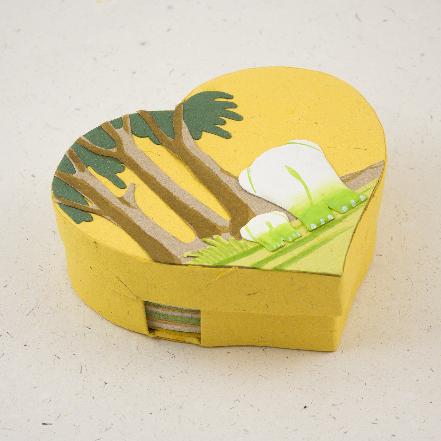 Introducing our Heart Shaped Note Box Elephant Yellow! Elevate your note-taking experience with our eco-friendly alternative to post-it notes. Each box features approximately 80 sheets of fine writing poo paper, adorned with a handcrafted elephant design. Perfect for gifting to teachers or office colleagues, these stationery sets combine practicality with charm. With dimensions of 4.5" x 4" x 1.75", our Heart Shaped Note Box Elephant Yellow adds a touch of brightness and sustainability to any workspace. Don't miss out on the opportunity to enhance your messaging with our unique and eco-conscious stationery solution!
