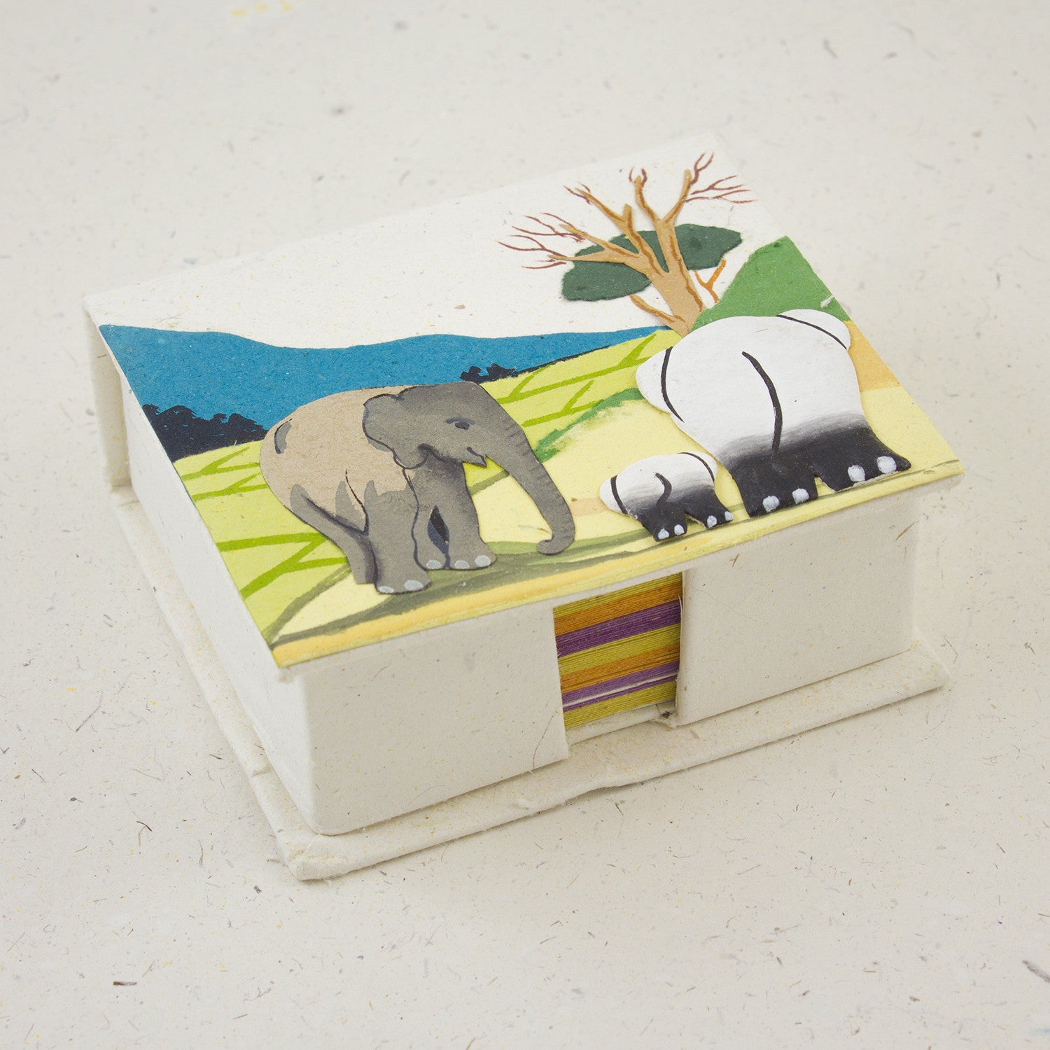 Sized at 4.5" x 4" x 1.75", the Elephant Note Box in Natural White showcases a handcrafted elephant design, set against the clean, crisp backdrop of natural white. This minimalist aesthetic not only enhances the beauty of your workspace but also serves as a symbol of the purity and resilience of nature. Ideal for gifts, this stationery set is a thoughtful choice for teachers, office colleagues, or anyone who appreciates the blend of functionality and environmental responsibility.