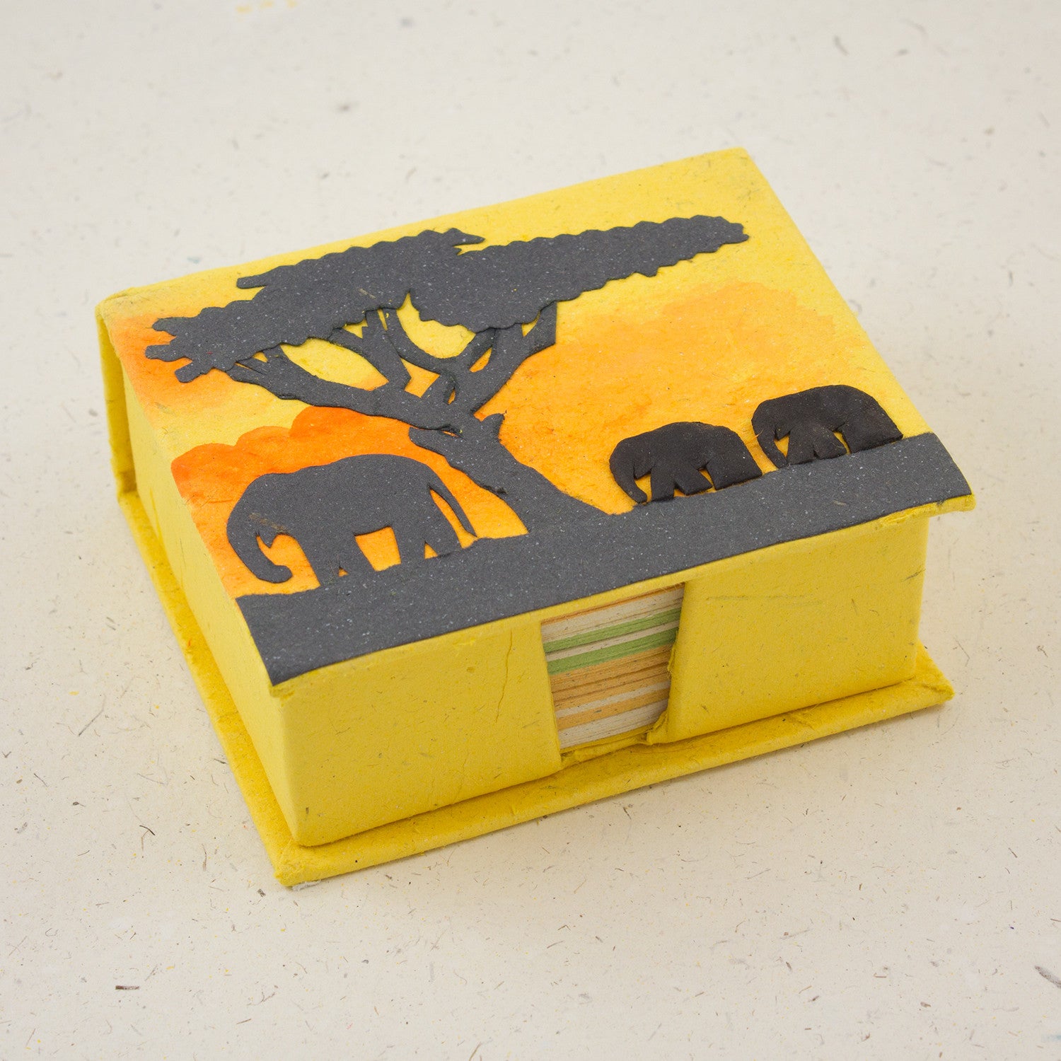 Measuring 4.5" x 4" x 1.75", the Elephant Note Box in Yellow features a handcrafted elephant design that adds a touch of warmth and whimsy to any space. The bright yellow hue not only captures the eye but also symbolizes optimism and the hope for a future where elephants and humans coexist harmoniously. This stationery set makes an ideal gift for teachers, office colleagues, or anyone who appreciates the importance of sustainable living and wildlife conservation.
