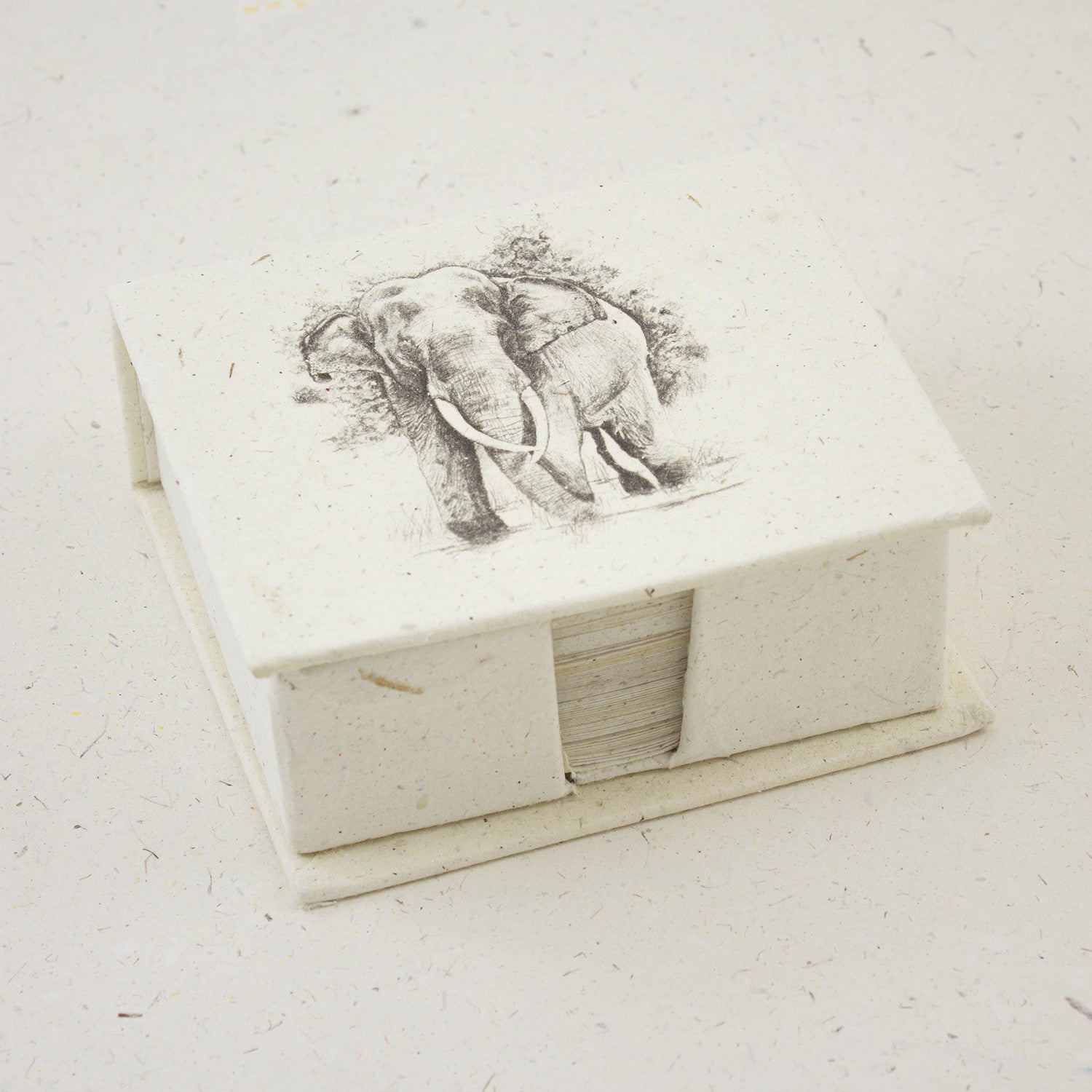 Sized at 4.5" x 4" x 1.75", the Tusker Sketch Note Box showcases a handcrafted design that captures the majestic essence of the tusker elephant in a sketch-style illustration, blending artistry with conservation. This stationery set serves as an ideal gift for teachers, office colleagues, or anyone with a heart for elephants and an eye for unique, eco-friendly products.