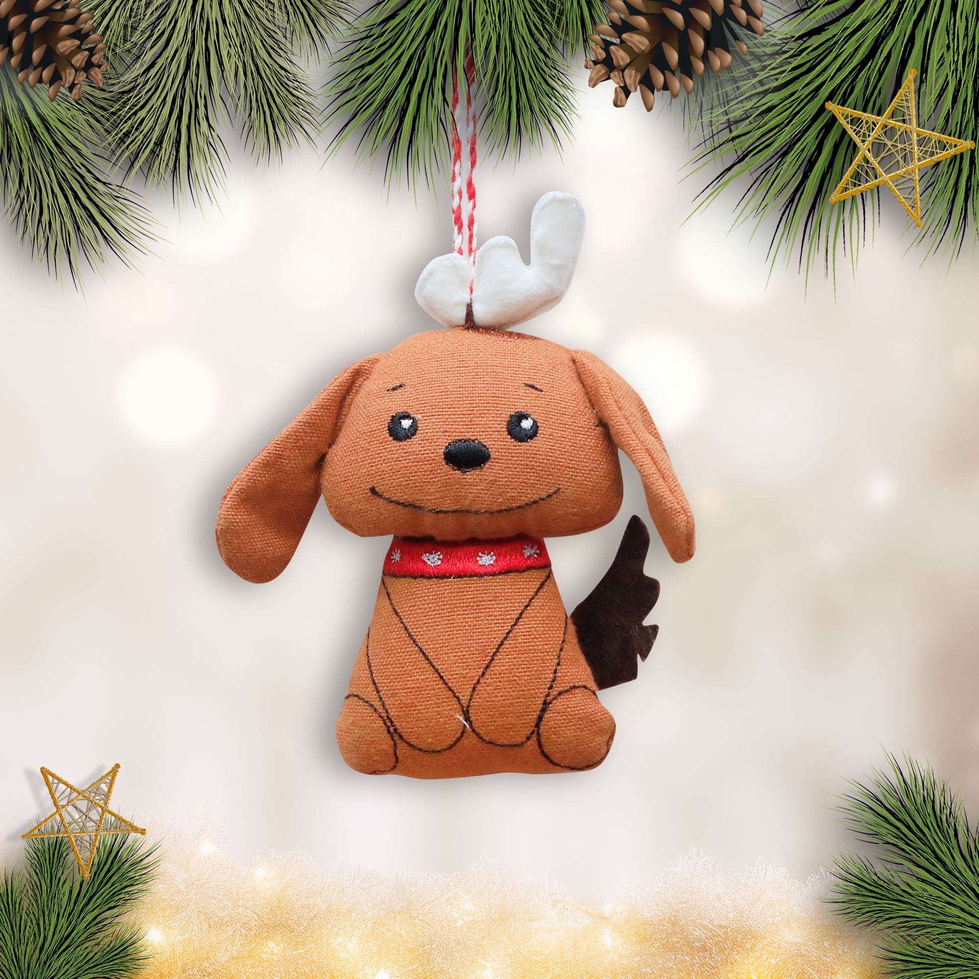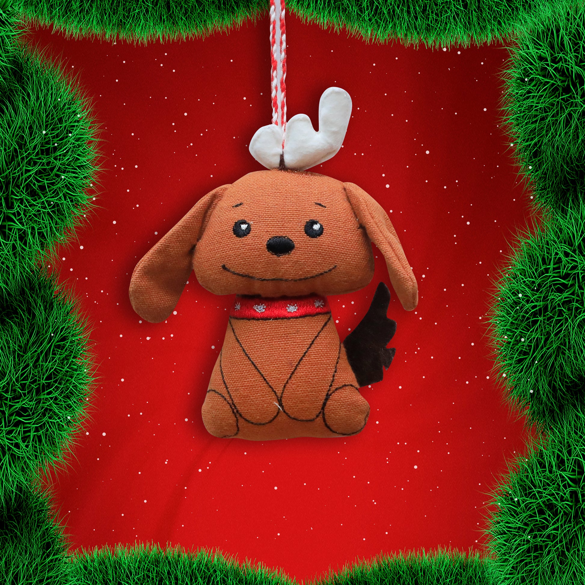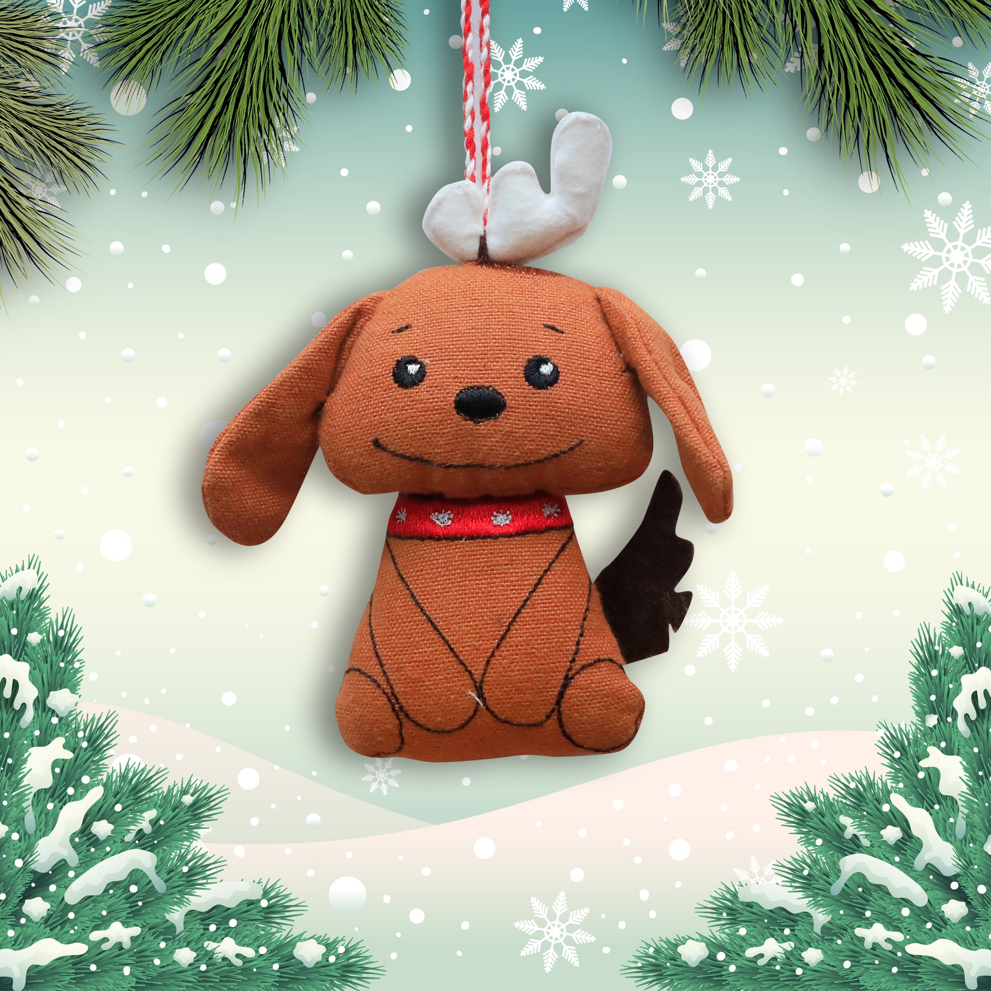 This adorable reindeer puppy ornament, inspired by a beloved holiday character, brings festive joy to any Christmas tree. Handcrafted from high-quality fabric, this cute pup features a reindeer antler on its head and a red holiday scarf around its neck. Perfect for dog lovers or fans of classic Christmas stories, this ornament adds a playful and heartwarming touch to holiday decor.