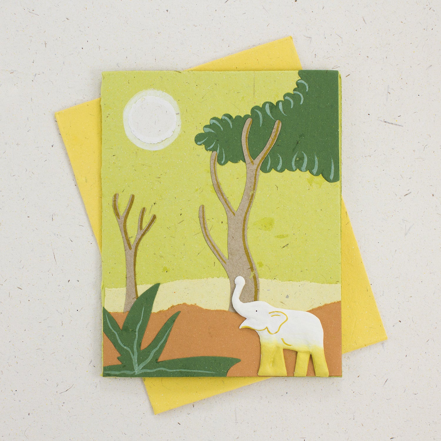 Upon opening this card, you are greeted with a blank insert of fine writing poo paper, a perfect canvas for your messages of joy, gratitude, or reflection for any occasion. The light green hue evokes a sense of growth and renewal, mirroring the majestic journey of elephants through their natural landscapes.