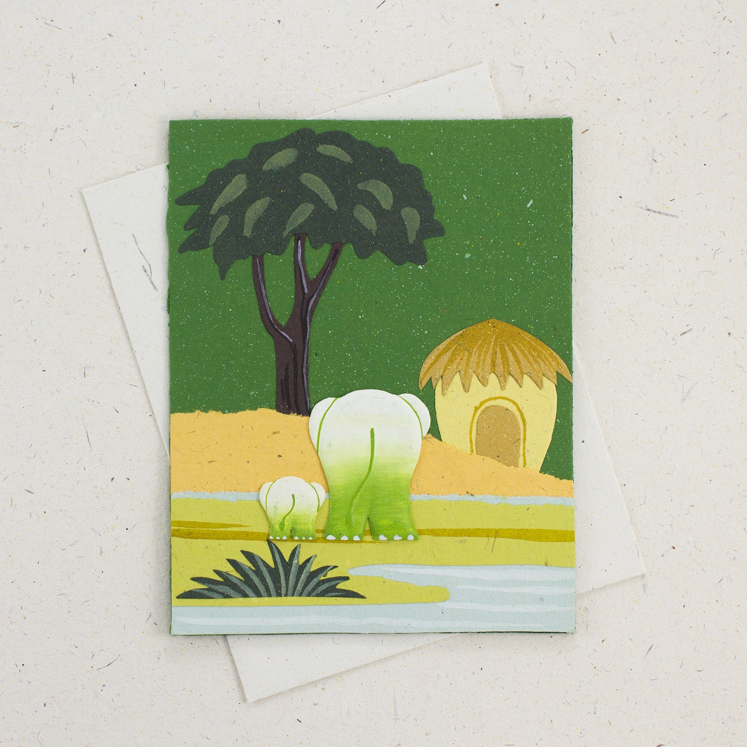 Within each card lies a blank insert of fine writing poo paper, ready to carry your heartfelt sentiments. Whether you're marking a special event, expressing gratitude, or simply sending a thoughtful note, this card offers a unique blend of elegance and environmental mindfulness, underscored by the strength and grace of an elephant in a serene dark green setting.