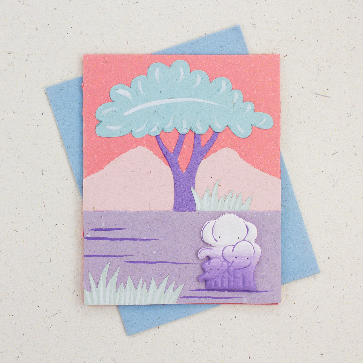 Open this card to find a blank insert of fine writing poo paper, ready to carry your most heartfelt messages. Whether you're commemorating a special event, expressing gratitude, or simply sharing a moment of connection, this card’s soothing pink background and the serene silhouette of an elephant offer a unique and meaningful backdrop for your words, emphasizing compassion, care, and the importance of preserving these gentle giants.
