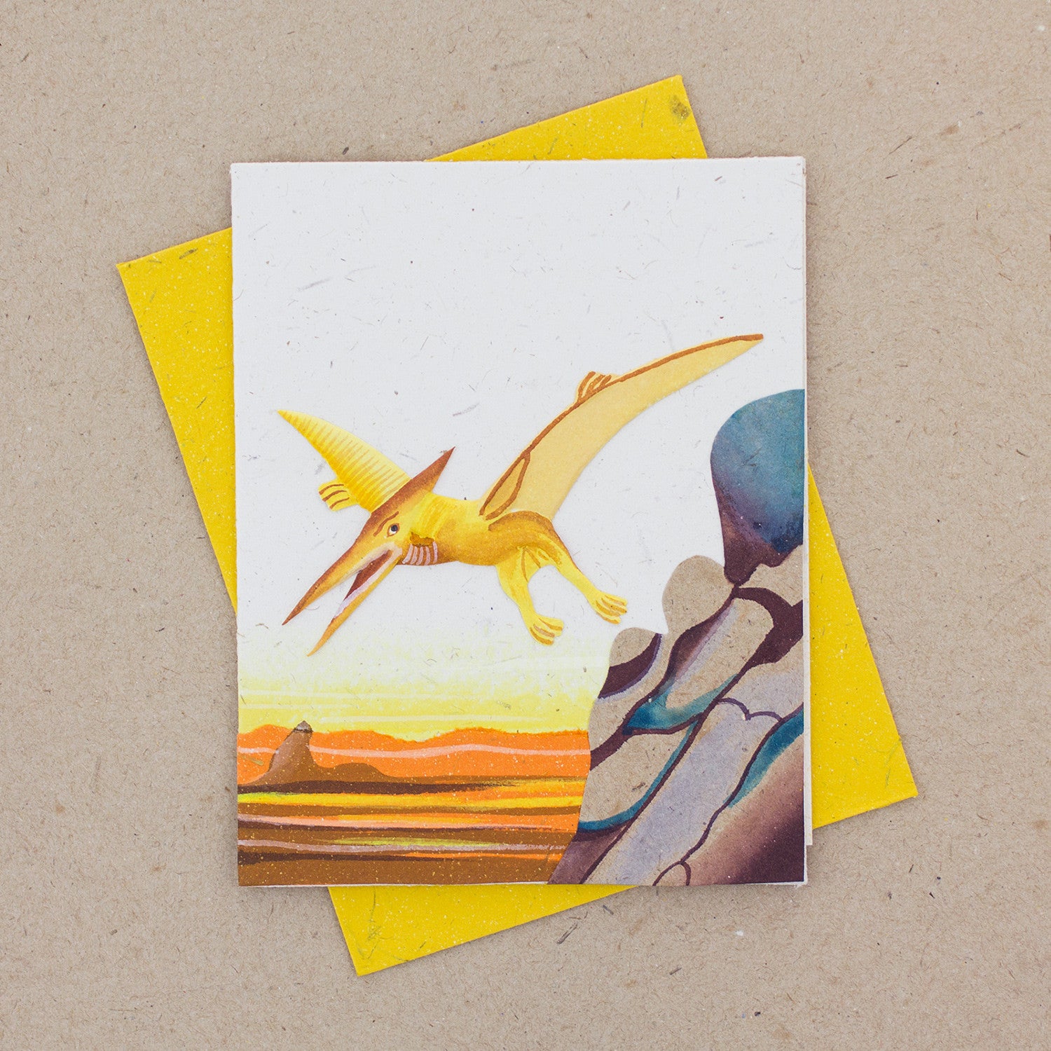 Upon revealing this card, a blank insert of fine writing poo paper awaits your inspired messages. Whether celebrating a milestone, sending wishes of adventure, or simply sharing a note of fascination, the silhouette of the pterodactyl against the natural white background adds a timeless and intriguing backdrop to your words, ensuring your message soars with imagination and distinction.