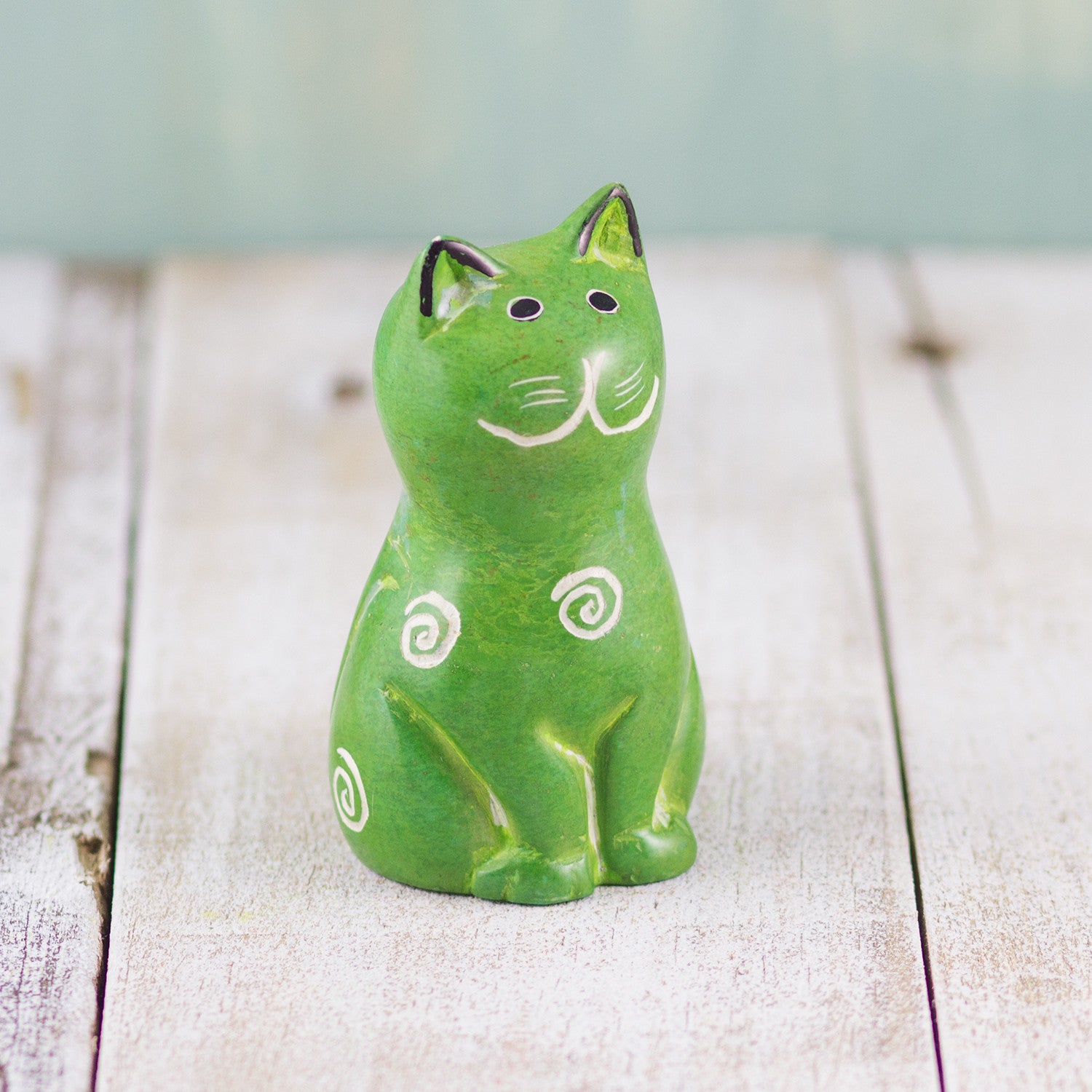 Crafted from the finest soapstone, known for its dense, smooth texture and durability, each green kitty cat is a unique piece of art, with no two sculptures exactly alike. Standing at approximately 3 inches tall, these charming feline figurines double as sophisticated decor and practical paperweights, making them perfect for adding a touch of whimsy to your office or living space.
