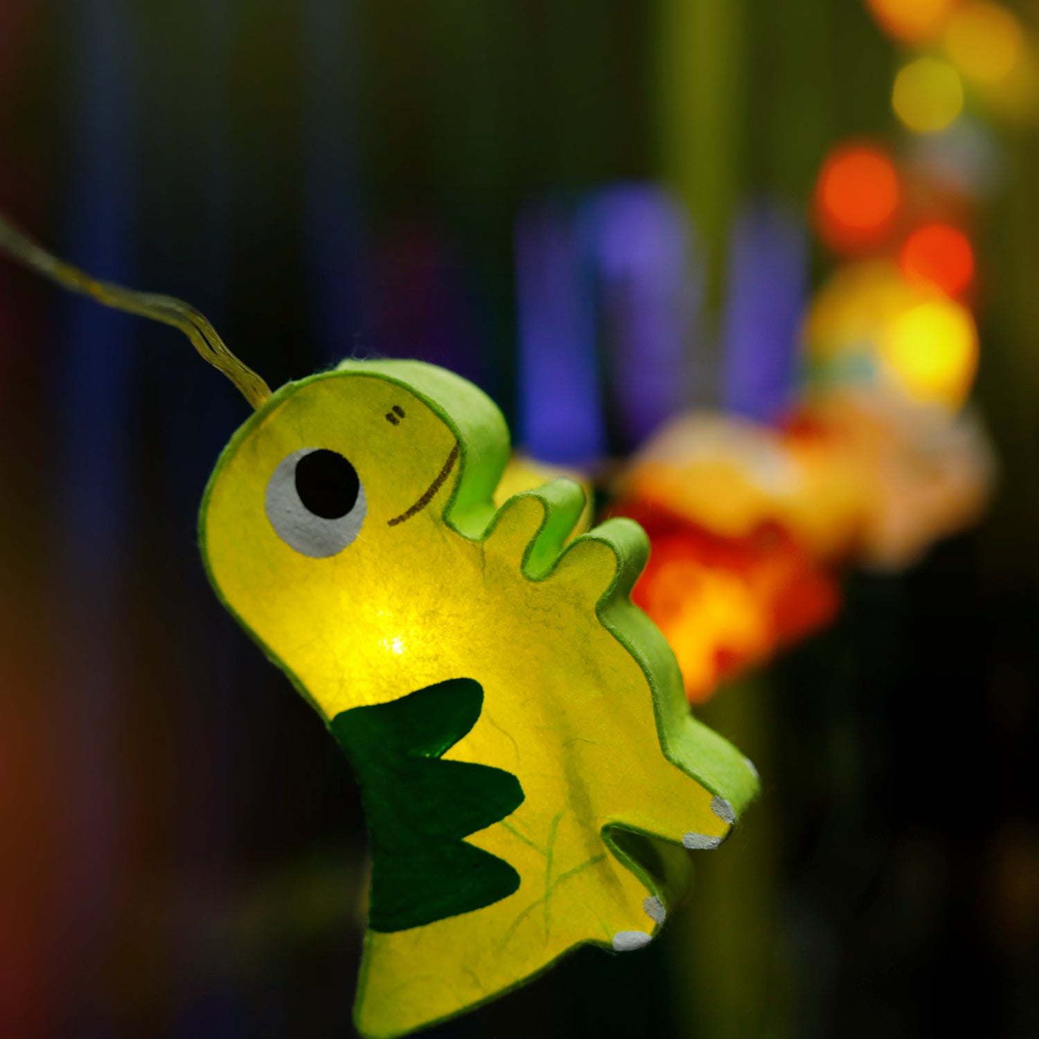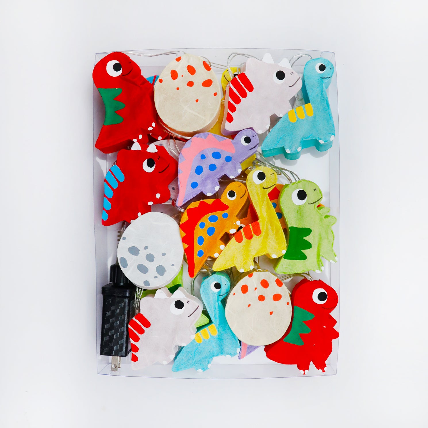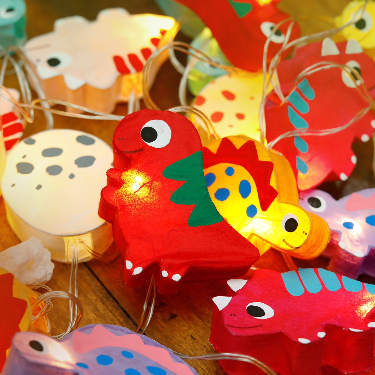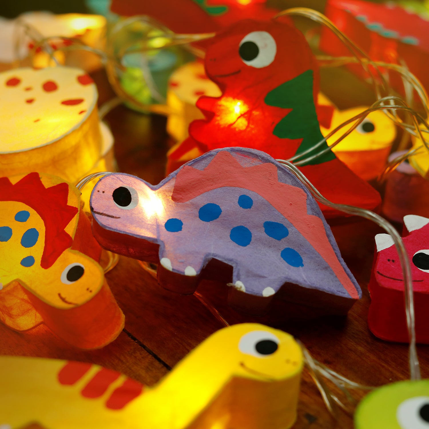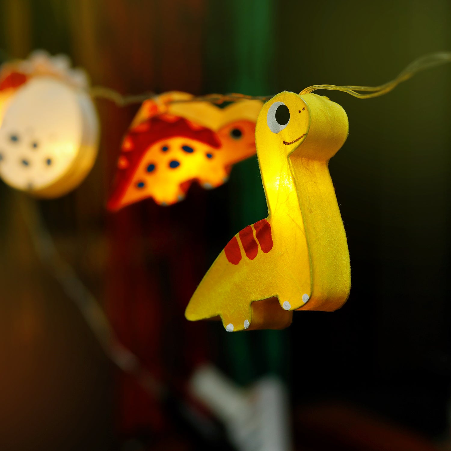 Light up your space with these fun and colorful Dinosaur Adventure String Lights from Mr. Ellie Pooh! Each light in this whimsical set is crafted from eco-friendly Saa paper and hand-painted by artisans in Northern Thailand. With cute and playful dinosaur designs, these lights bring a sense of adventure to any room, making them perfect for children's rooms, playrooms, or themed parties.