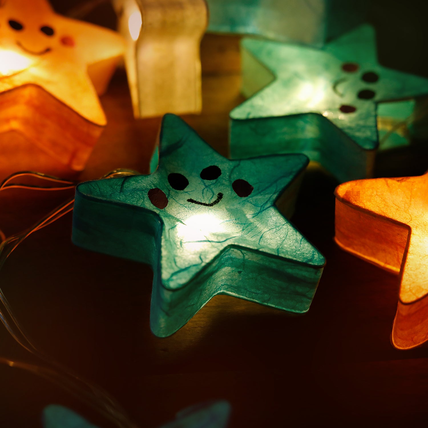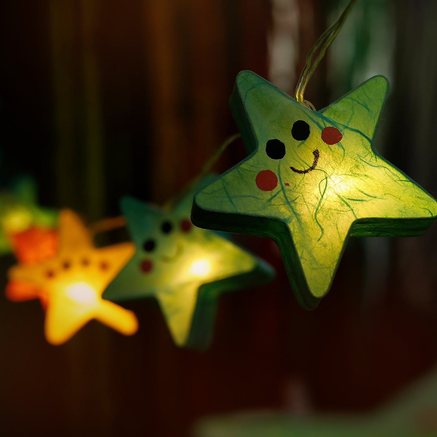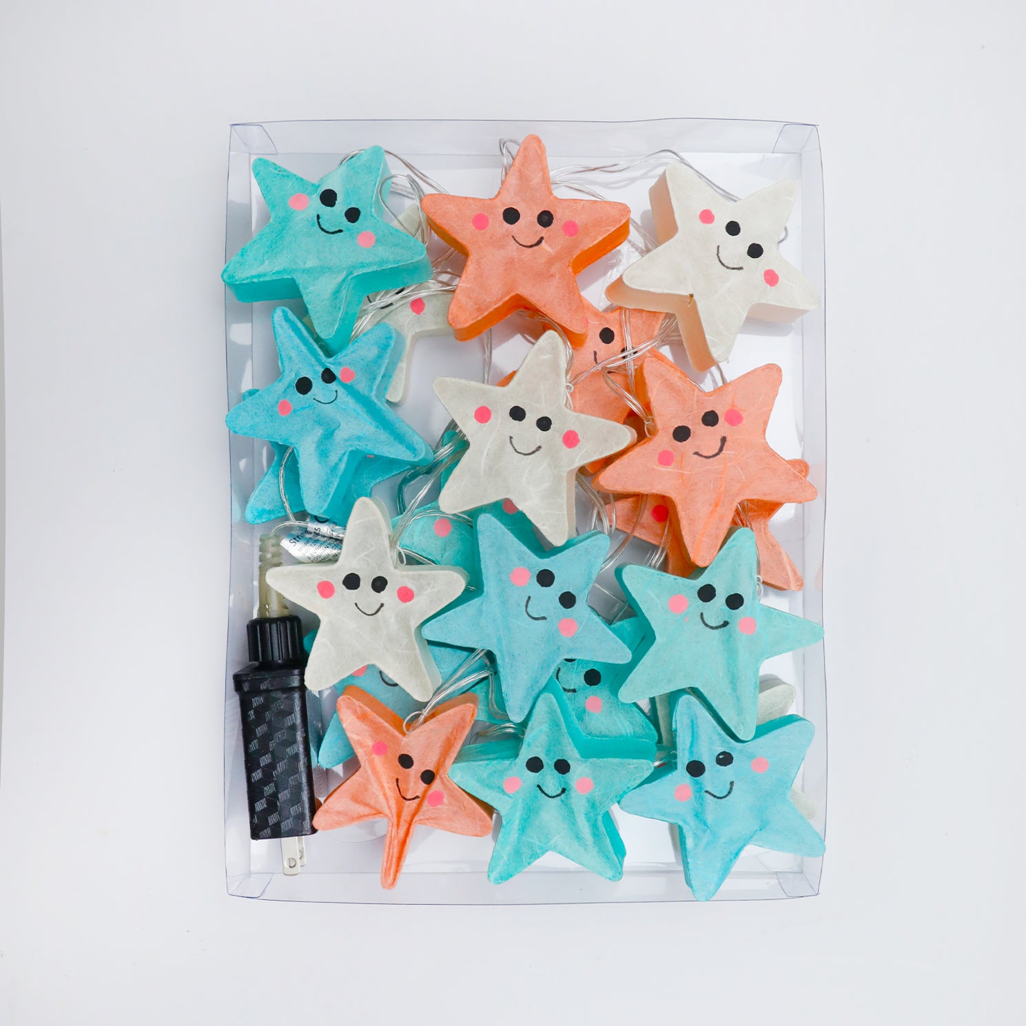 Brighten up any space with this charming set of Mr. Ellie Pooh Fair Trade Pastel String Lights! Each string features 20 delightful star-shaped LED lights in soft pastel colors—blush pink, mint green, and sky blue. Handcrafted from eco-friendly paper made from recycled elephant dung, these lights are as sustainable as they are cute. The cheerful smiling stars will add a whimsical touch to nurseries, kids' rooms, or outdoor parties. The lights are approximately 8 feet long and are made by talented artisans in Northern Thailand, creating not just beautiful decor but also supporting fair trade practices. Ideal for creating a warm, inviting atmosphere with a playful twist!