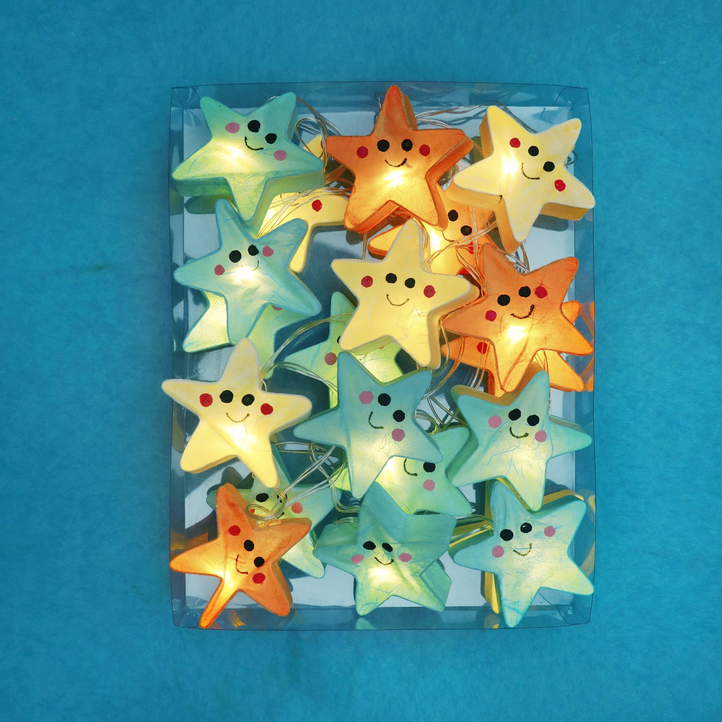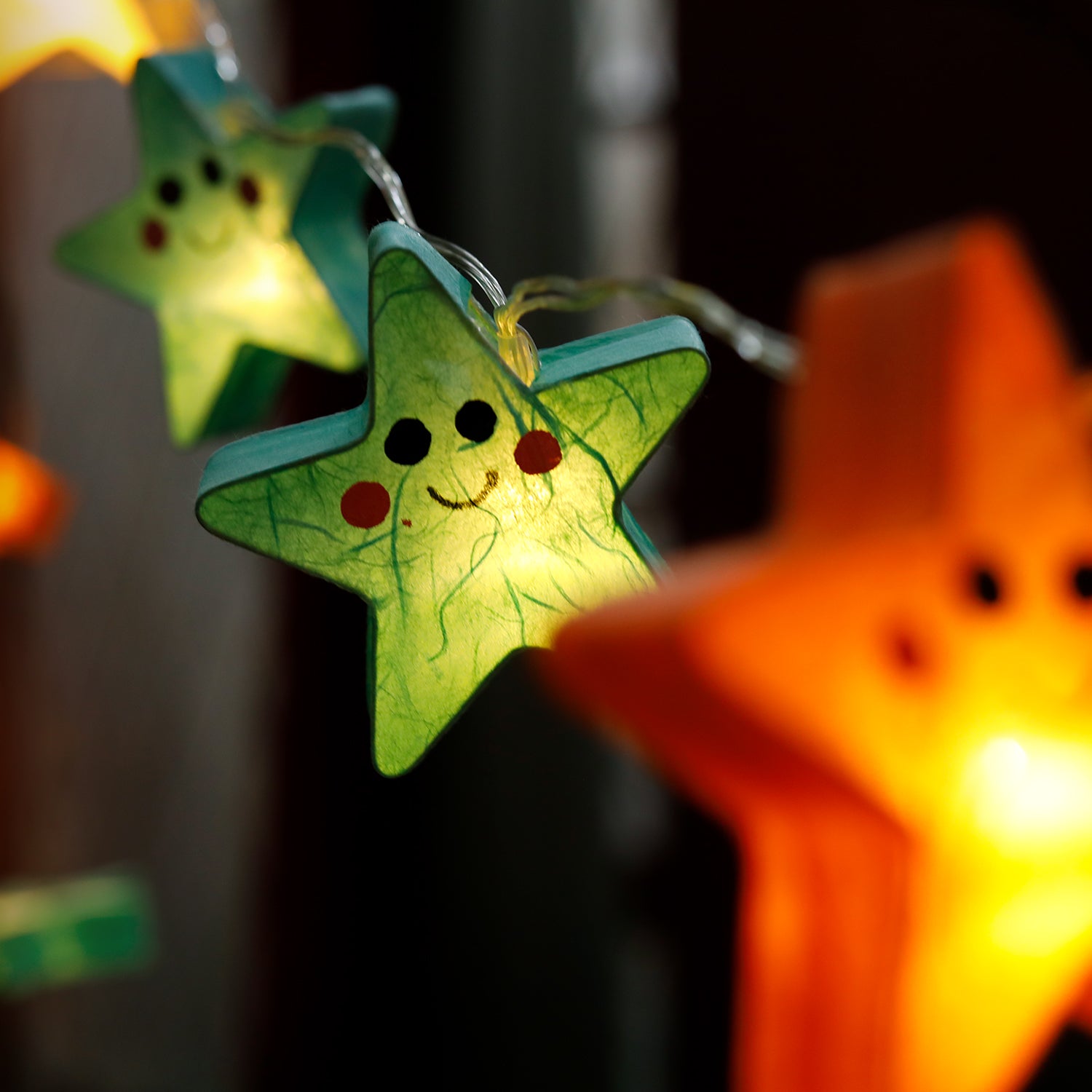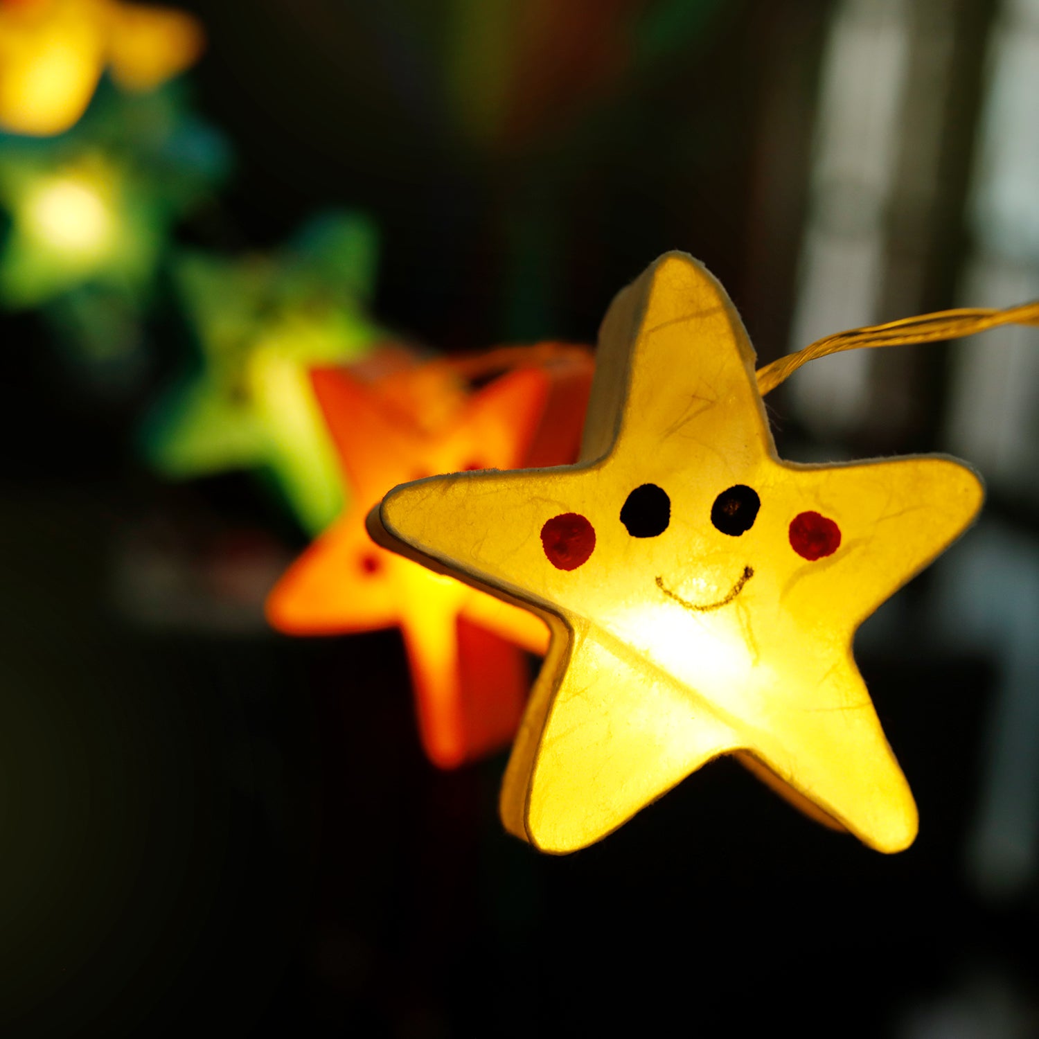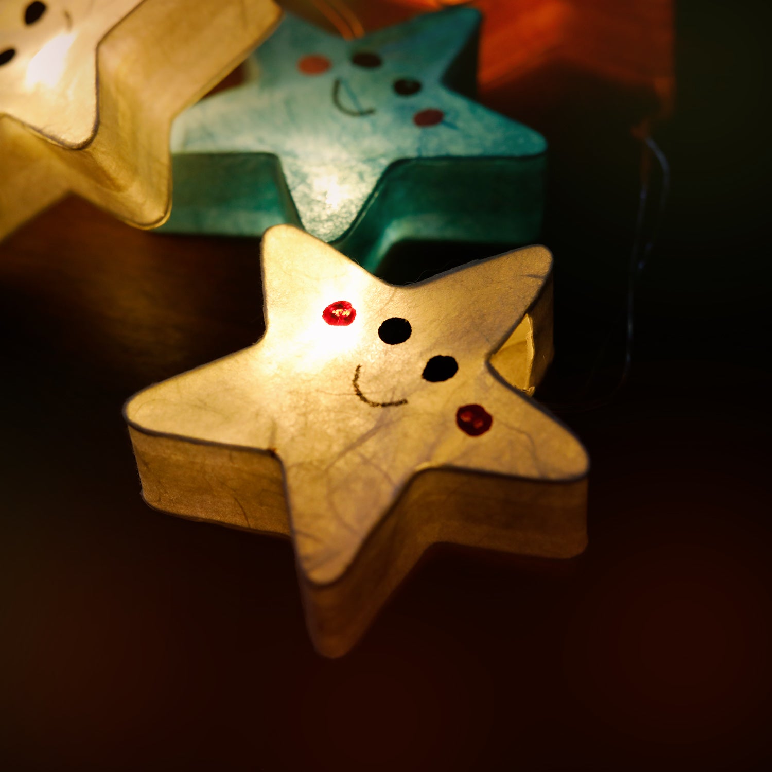 Brighten up any space with this charming set of Mr. Ellie Pooh Fair Trade Pastel String Lights! Each string features 20 delightful star-shaped LED lights in soft pastel colors—blush pink, mint green, and sky blue. Handcrafted from eco-friendly paper made from recycled elephant dung, these lights are as sustainable as they are cute. The cheerful smiling stars will add a whimsical touch to nurseries, kids' rooms, or outdoor parties. The lights are approximately 8 feet long and are made by talented artisans in Northern Thailand, creating not just beautiful decor but also supporting fair trade practices. Ideal for creating a warm, inviting atmosphere with a playful twist!
