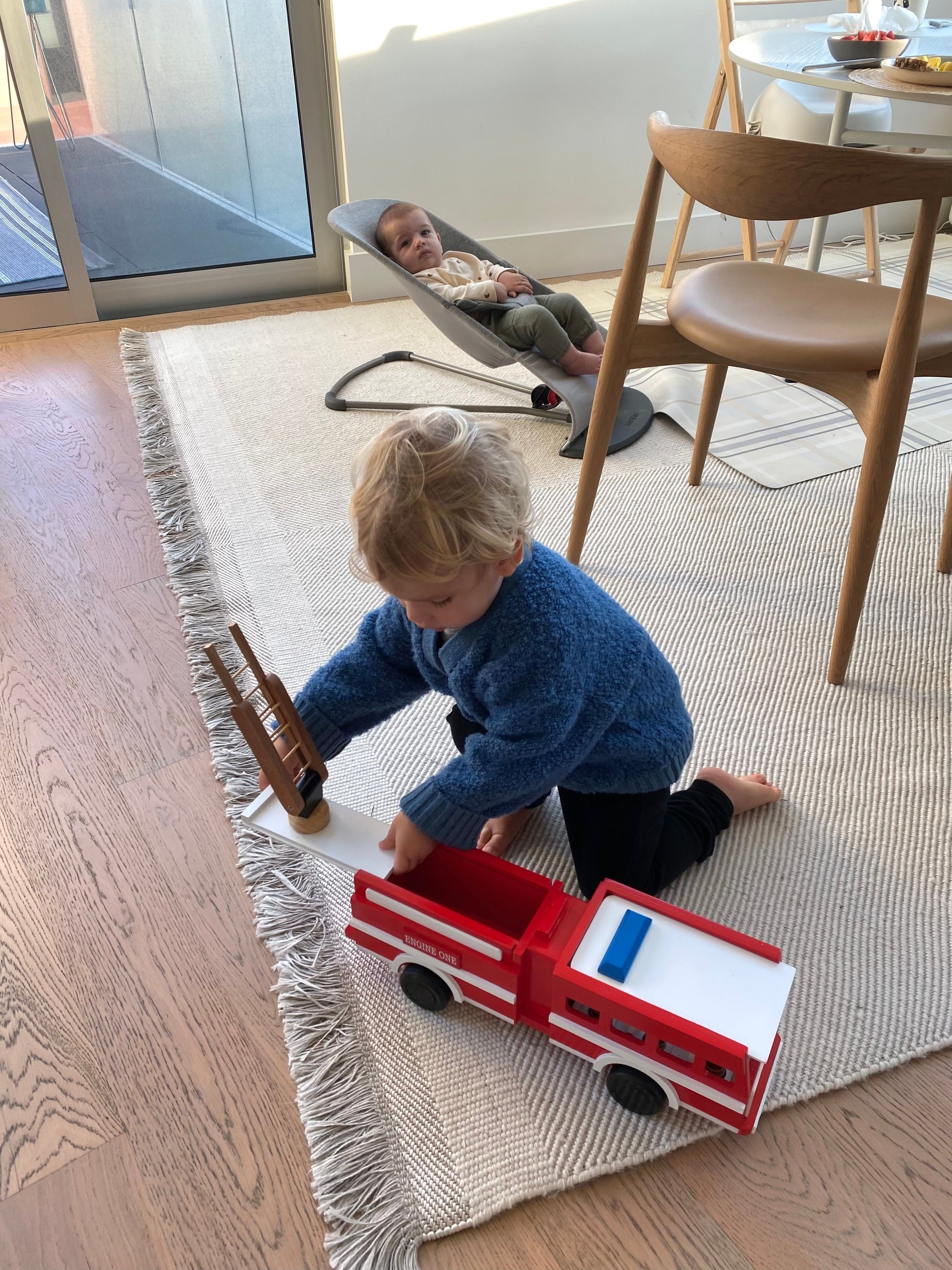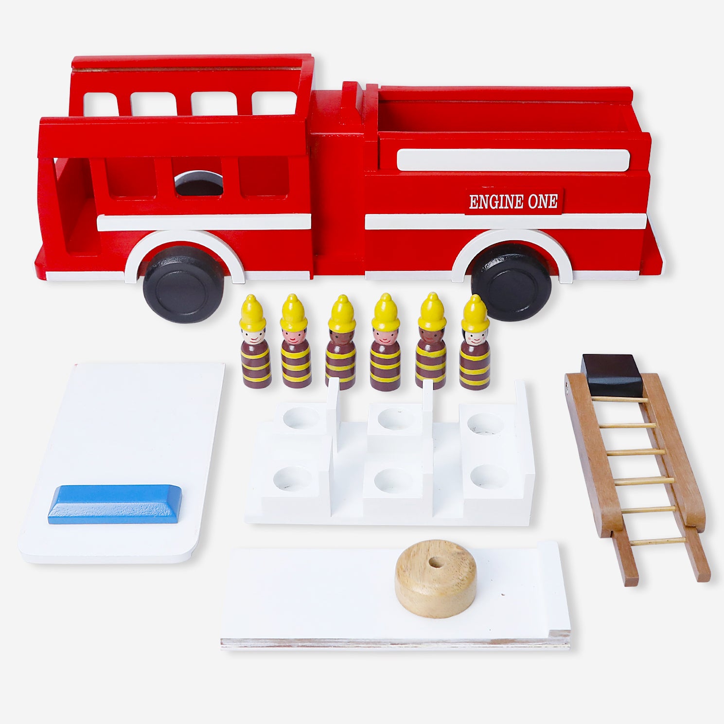 The removable roof and extendable ladder add layers of interactive play, encouraging children to engage with the toy in various ways, from placing the firefighters inside the truck to extending the ladder for high-stakes rescues. The smooth, spinning wooden wheels ensure Engine One is always ready for action, be it a rescue mission in the living room or a daring operation in the backyard.