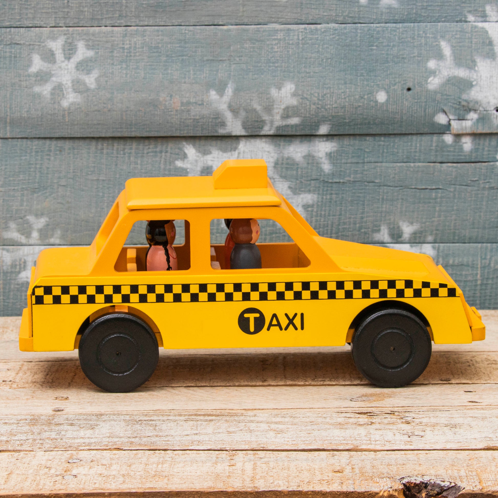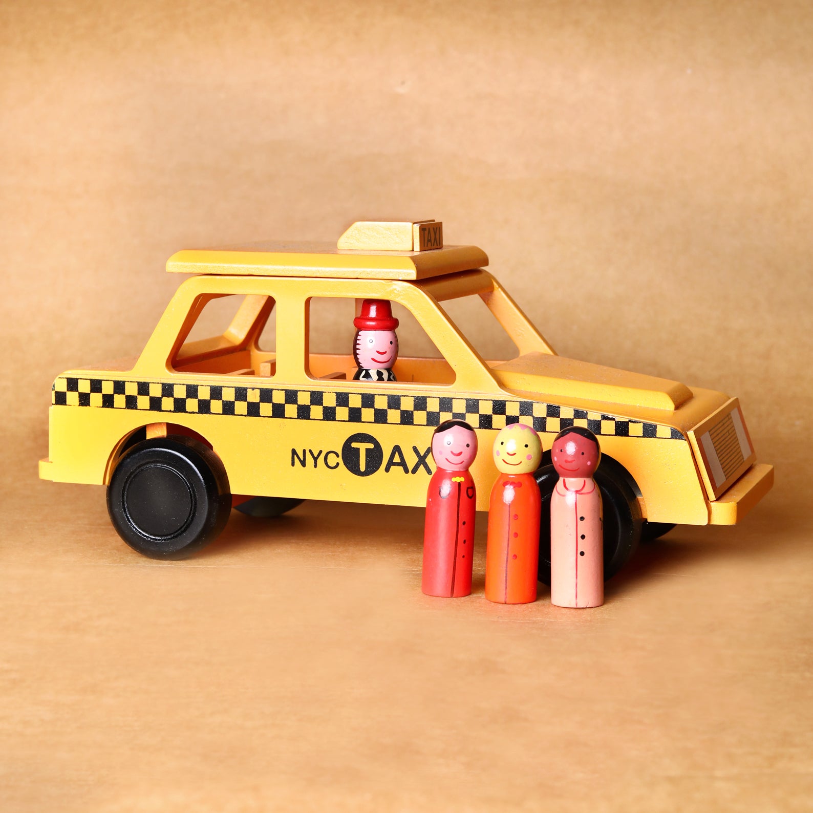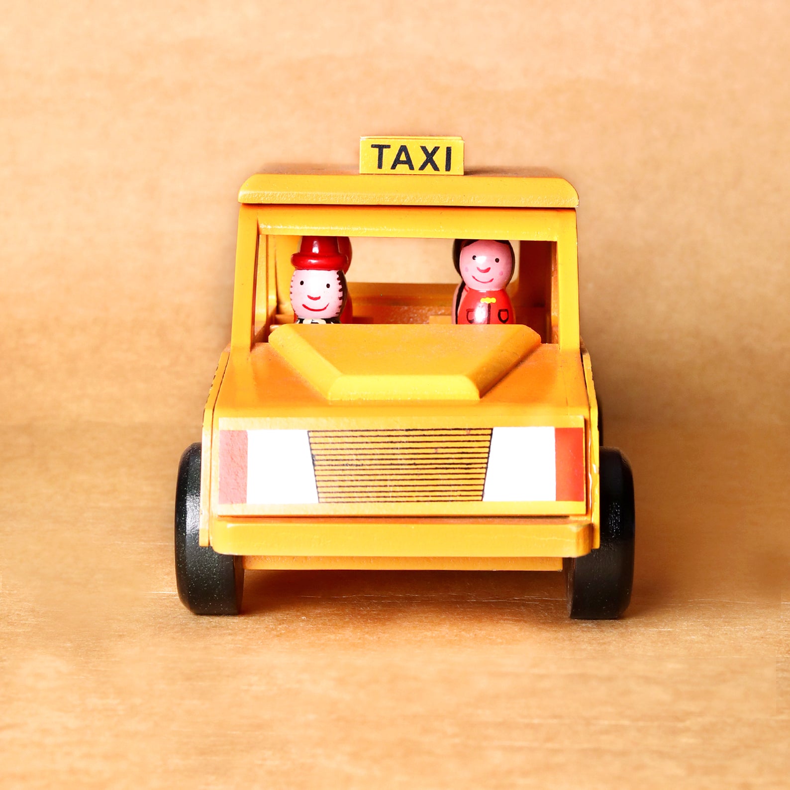 The removable roof adds an extra layer of interactive play, allowing children to place the passengers and driver inside the taxi, creating their own stories and adventures. The spinning wooden wheels glide smoothly across surfaces, making it easy for young drivers to navigate through their imaginative worlds.