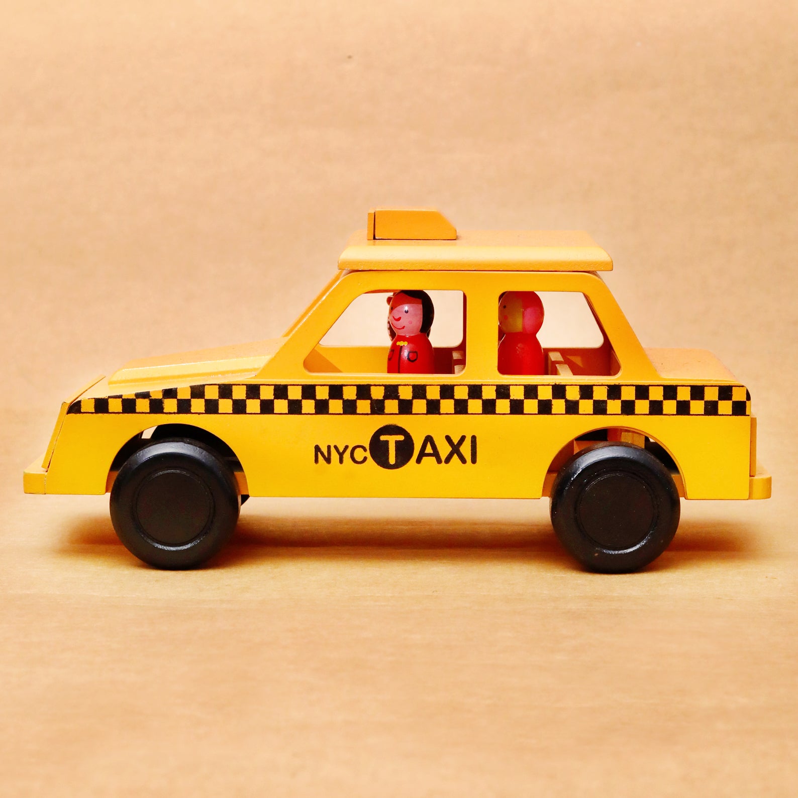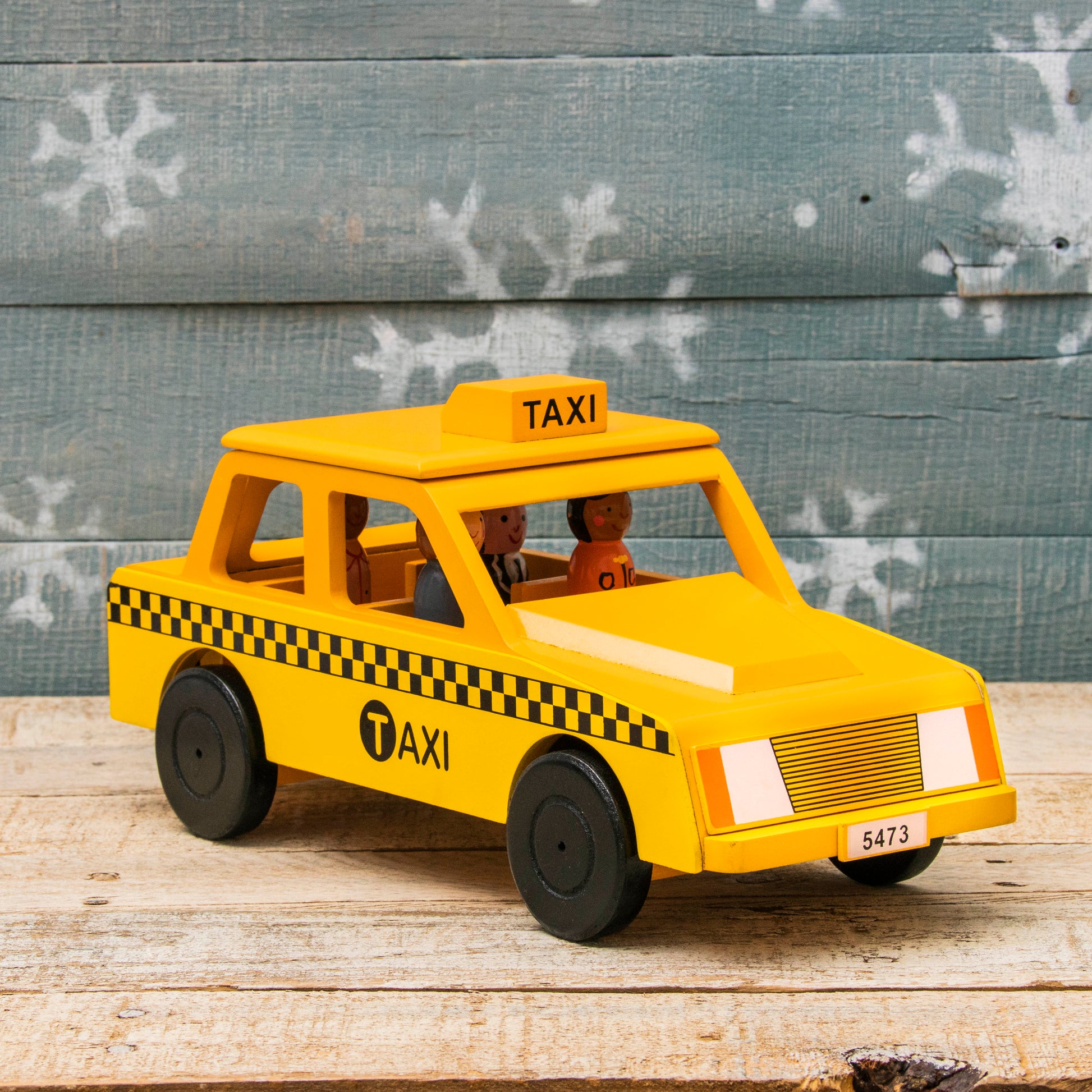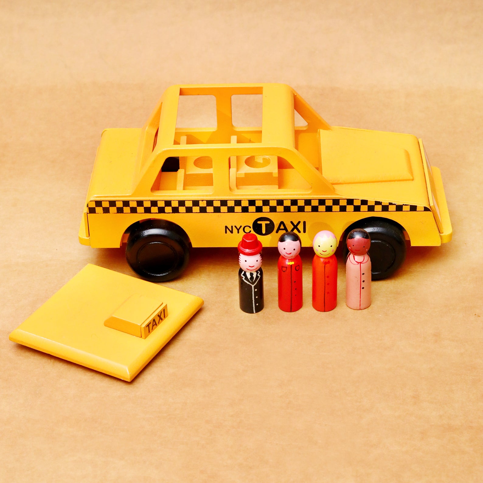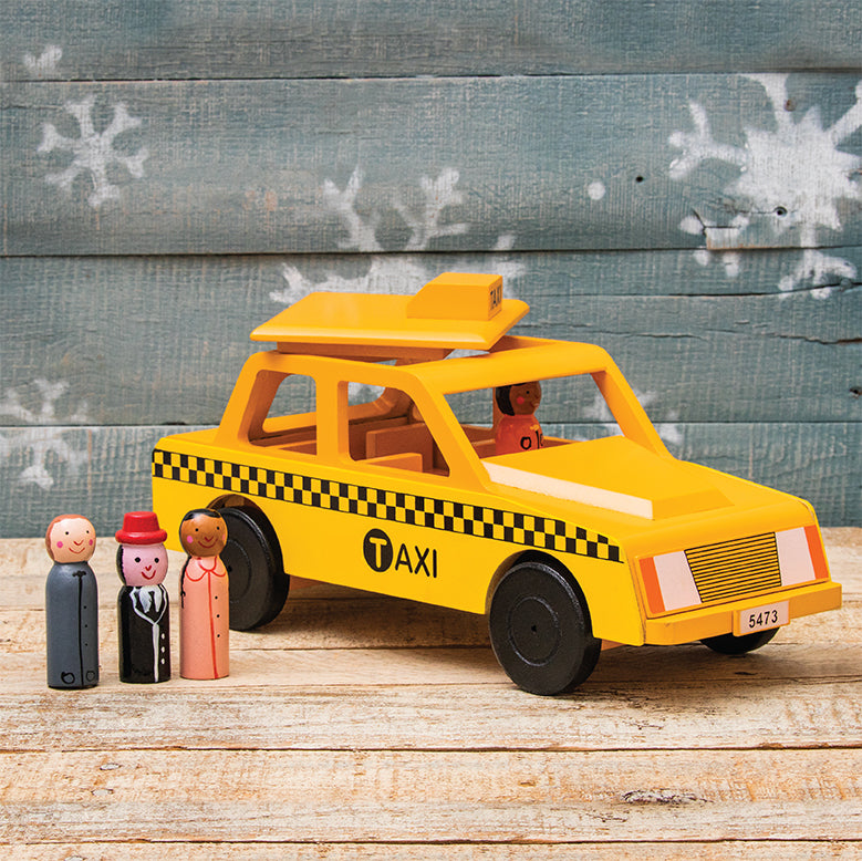The removable roof adds an extra layer of interactive play, allowing children to place the passengers and driver inside the taxi, creating their own stories and adventures. The spinning wooden wheels glide smoothly across surfaces, making it easy for young drivers to navigate through their imaginative worlds.